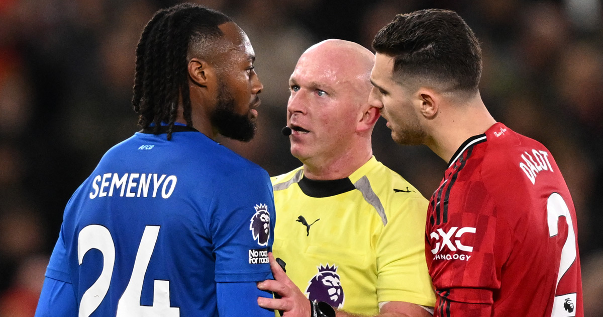 จุดเดือดหลักอยู่ที่จังหวะท้ายครึ่งแรก อ็องตวน เซเมนโย่ ปีกทีมชาติกานาของ บอร์นมัธ ไปมีเรื่องกับ ดีโอโก้ ดาโลต์ แบ็กขวา แมนยู หลังจากชนกันกลางอากาศจนล้ม จากนั้น เซเมนโย่ ลุกขึ้นมาเผชิญหน้า และเอื้อมมือไปจับบริเวณคอของ ดาโลต์ อย่างชัดเจน จนผู้ตัดสิน ไซม่อน ฮูเปอร์ ให้ใบเหลืองทั้งคู่ ทว่า VAR ก็ไม่แทรกแซง